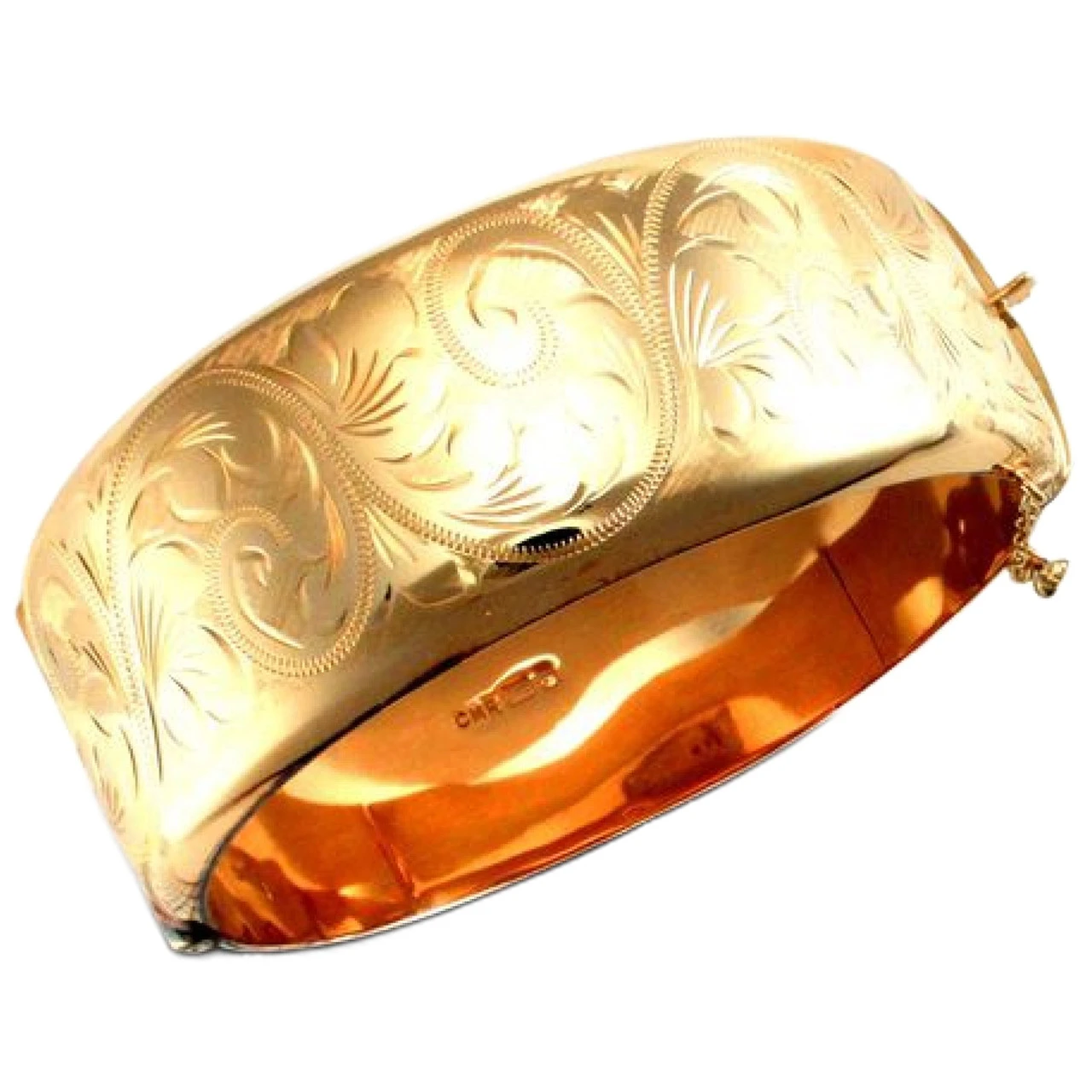 - Stunning 9 Carat Yellow Gold Victorian Design Engraved Premium Weight Bangle with a Concealed Box Snap Fitting and Safety Chain.