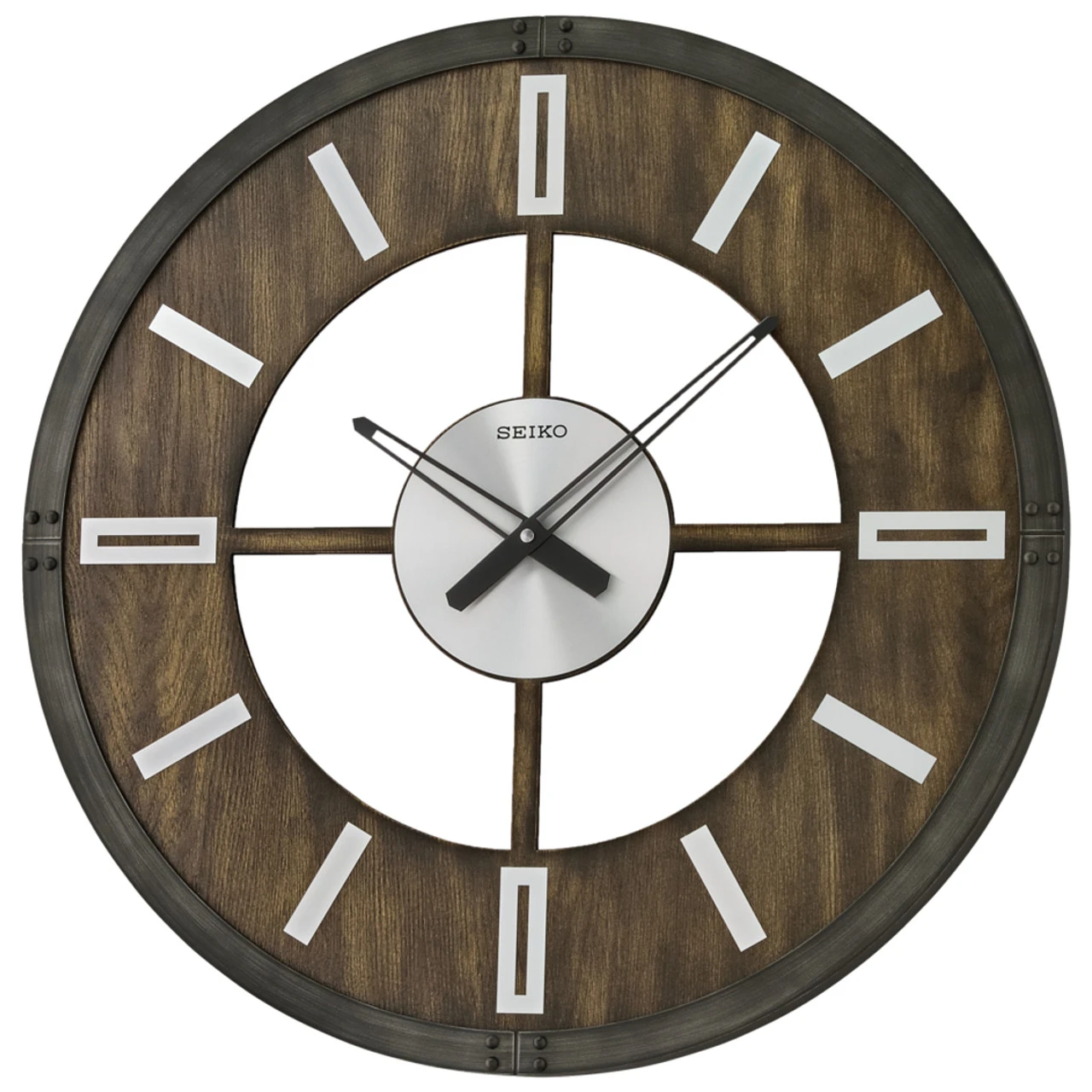 - This Seiko wall clock features a brown wooden dial with a grey box.