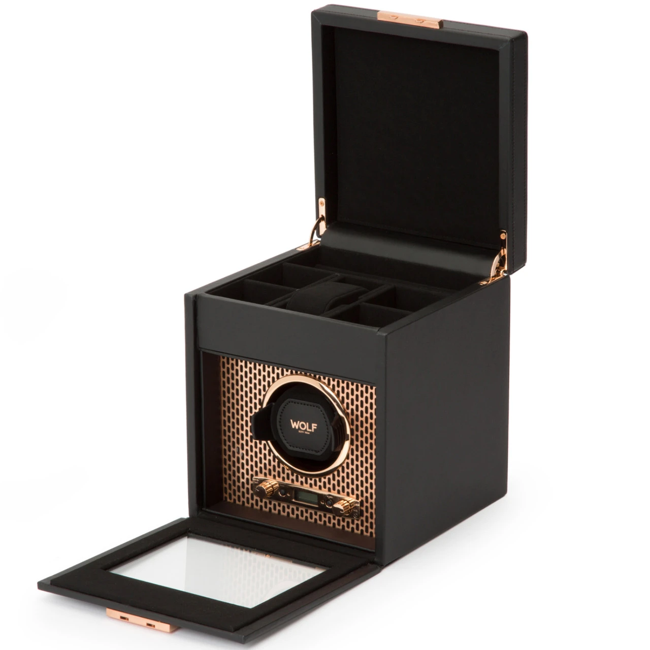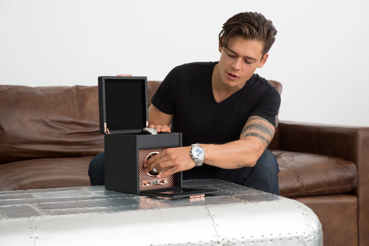 - This watch winder has copper-plated laser cut perforated steel melded with clean, sleek lines.