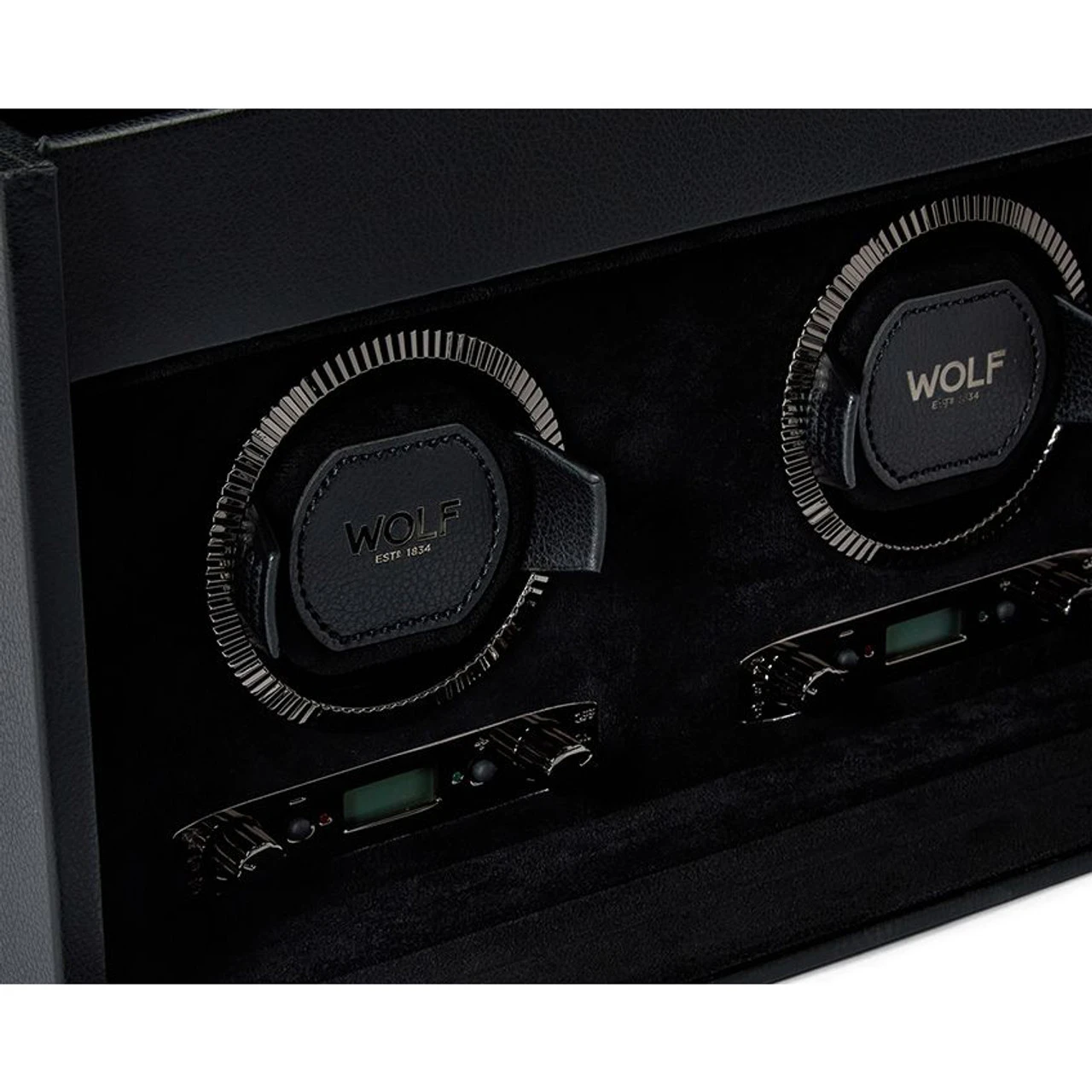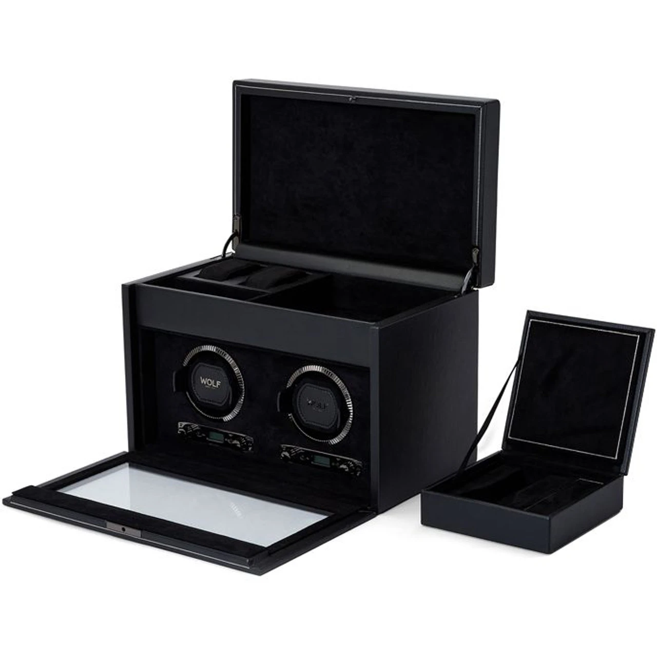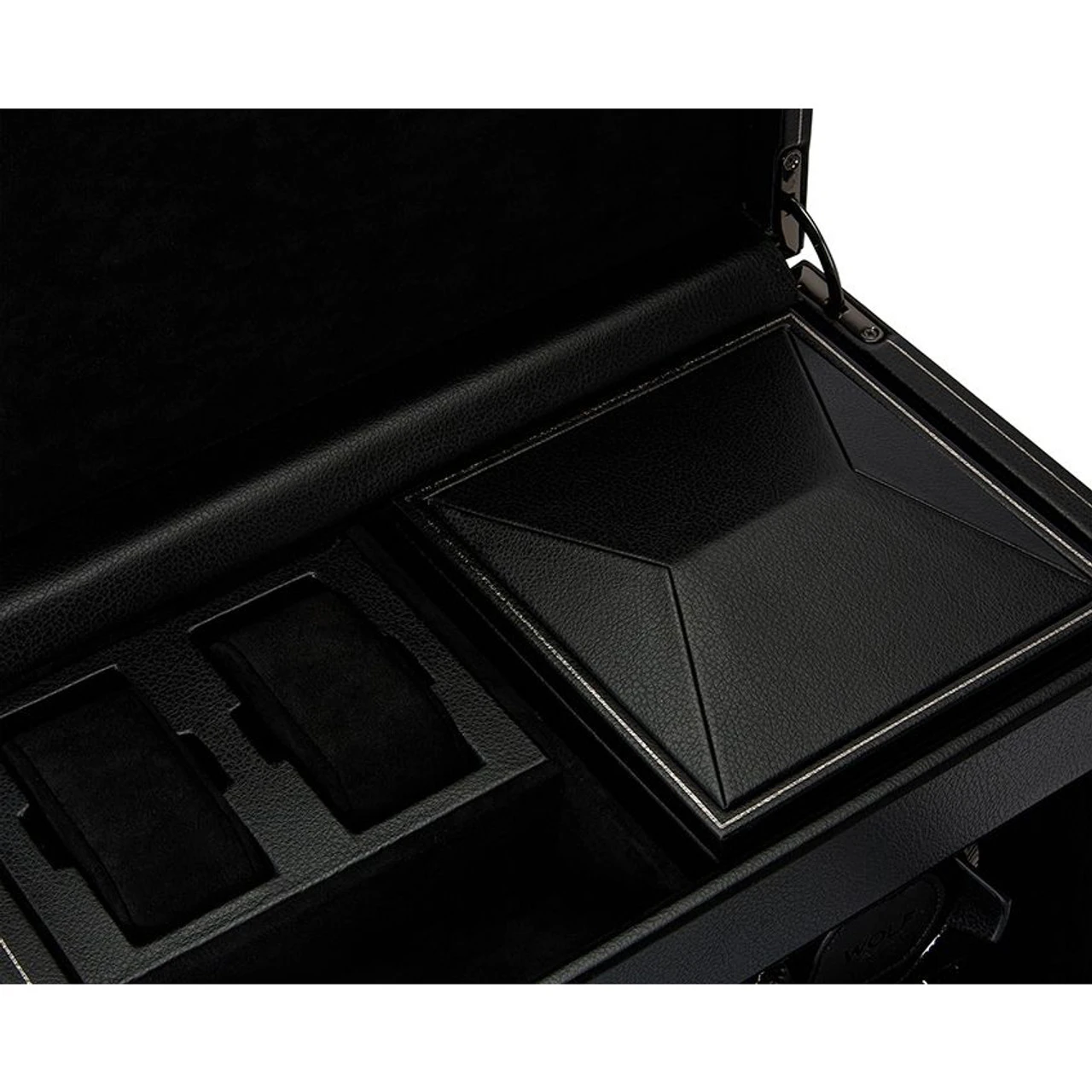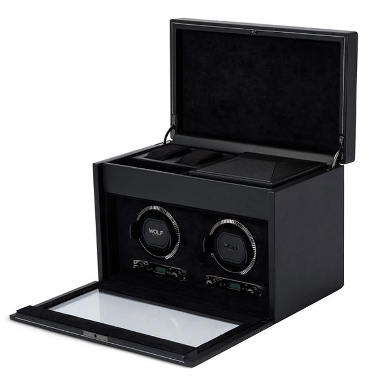 | Storage | 2 winding modules, 2pc watch storage with suspended cushions, 1 open compartment, travel case (1pc watch storage, 1 lidded compartment) |