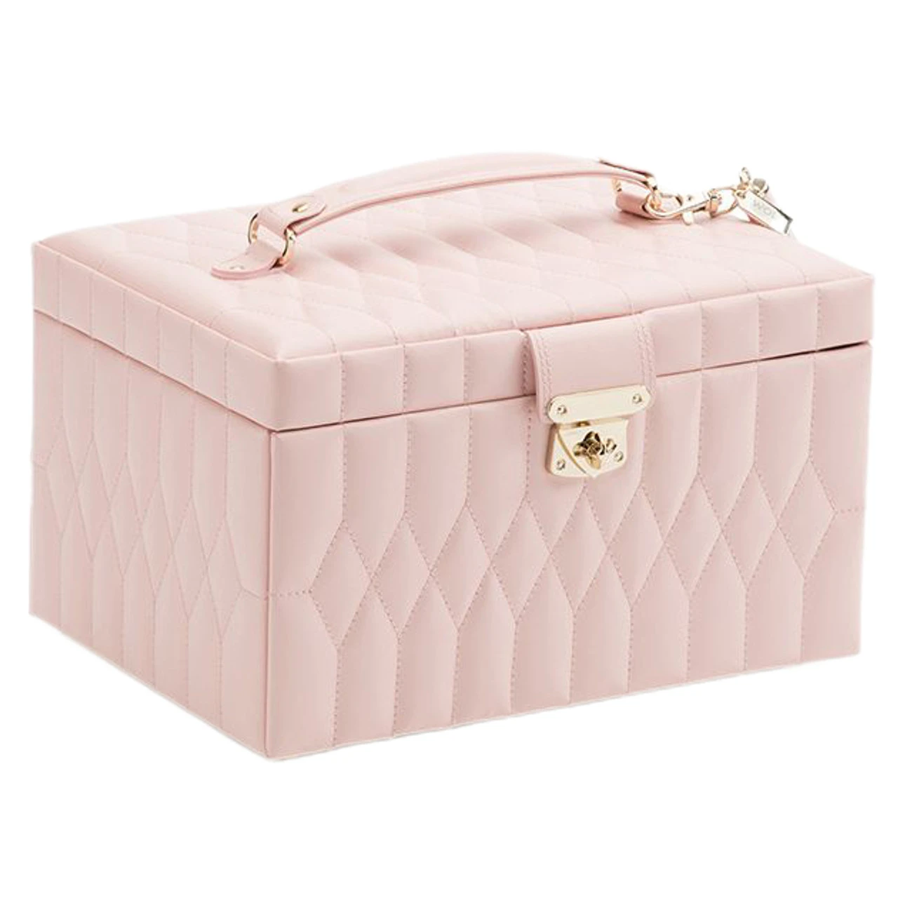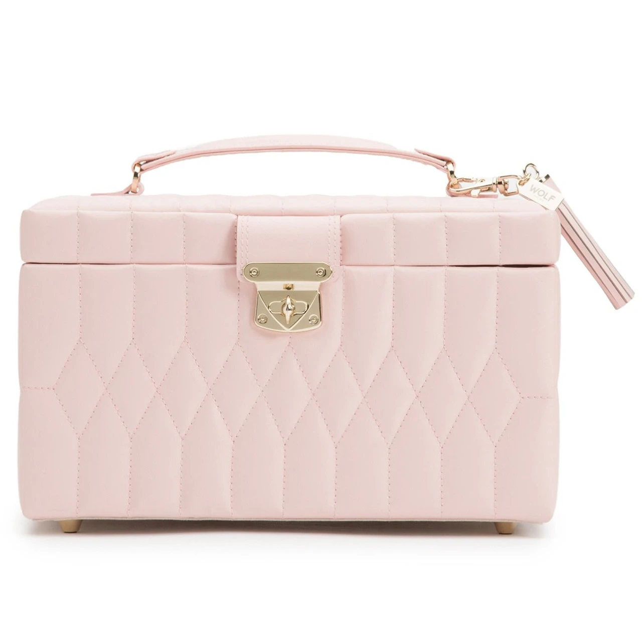 - The Caroline Medium Jewellery Case, a timeless classic with elegant soft lines of the 50’s, supple diamond-quilted leather accented with gold hardware.