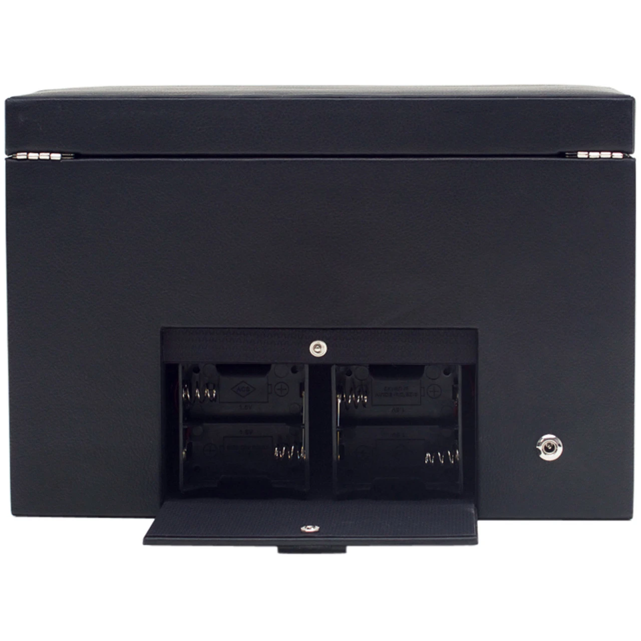 - The watch winder has a pebble-finish black leather exterior.